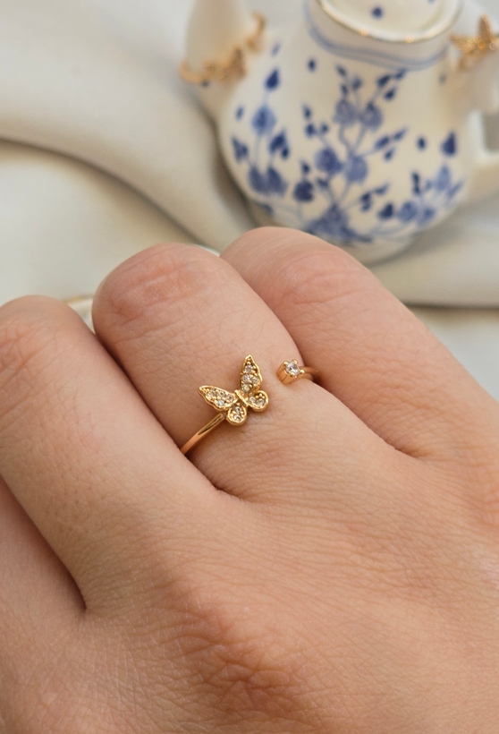 انگشتر پروانه طلایی، انگشتر دخترانه ژوپینگ، انگشتر نگیندار شیک، انگشتر زنانه خاص، اکسسوری پروانهای، خرید انگشتر ژوپینگ