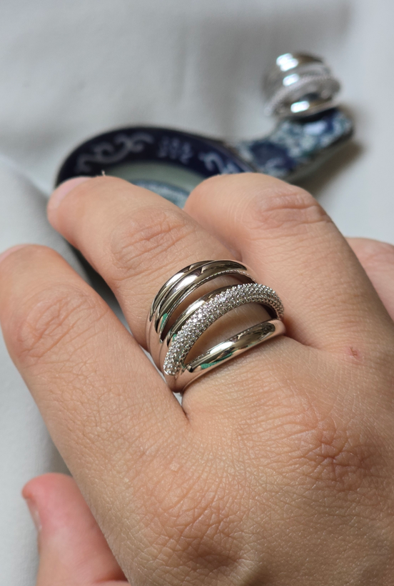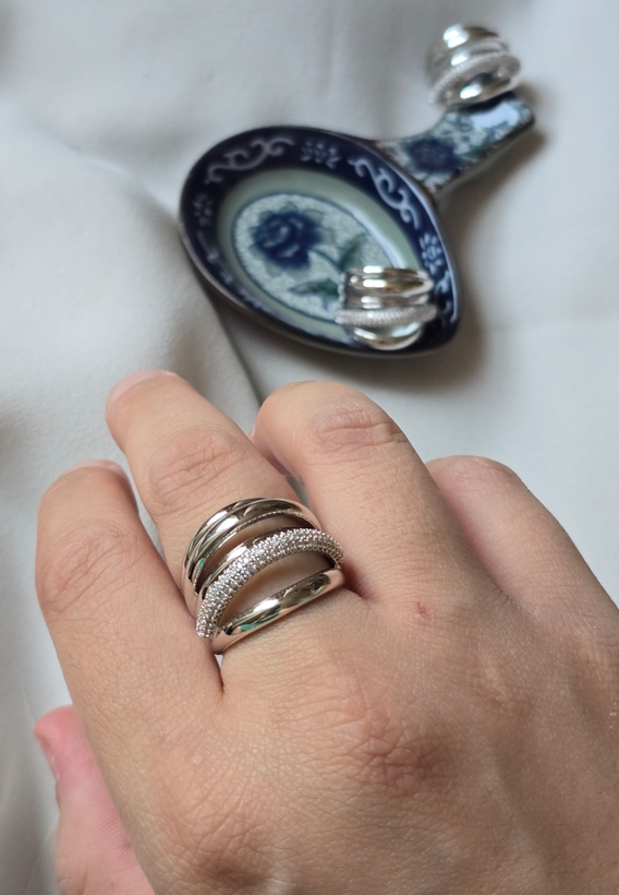انگشتر زنانه ژوپینگ مدل موج نقرهای با طراحی خاص چندلایه، یکی از جذابترین انتخابها برای خانمهاییست که به استایل لاکچری و خاص علاقه دارند. این انگشتر با ترکیب نگینهای درخشان و روکش براق نقرهای، جلوهای خیرهکننده به دستان شما میدهد. مناسب برای مهمانی، قرارهای خاص یا حتی استفاده روزمره با استایل مینیمال و شیک.