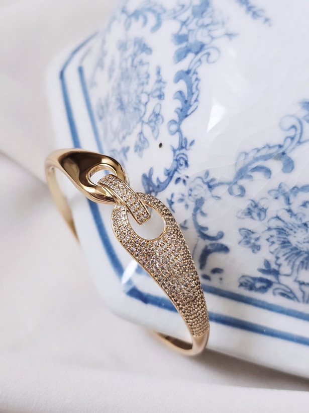 جلوهای از درخشش و ظرافت این بنگل رزگلد با نگینهای درخشان و طراحی مجلسی، انتخابی بینقص برای استایلهای خاص و رسمیست. ساختهشده از آلیاژ مس با ثبات رنگ بالا و درخششی ماندگار که گذر زمان از زیباییاش کم نمیکند .