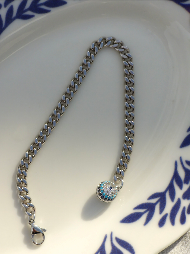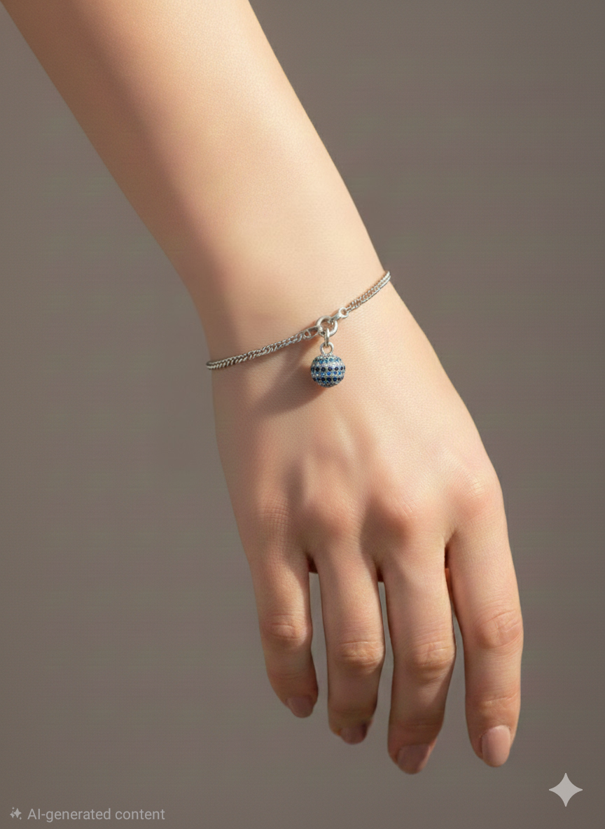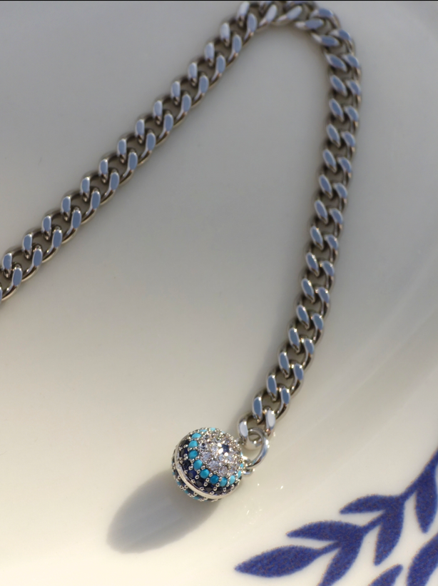 گوی این دستبند با تکنیک مخراجکاری میکرو طراحی شده است. نگینهای اتمی با طیف رنگی آبی کلاسیک، سرمهای و کریستالی در کنار هم چیده شدهاند تا تداعیگر درخشش الماس در شب باشند. زنجیر کارتیر بسیار ظریف این کار، علاوه بر استحکام بالا، حسی سبک و راحت روی پوست ایجاد میکند که آن را برای استفاده روزمره و طولانیمدت ایدهآل میسازد.