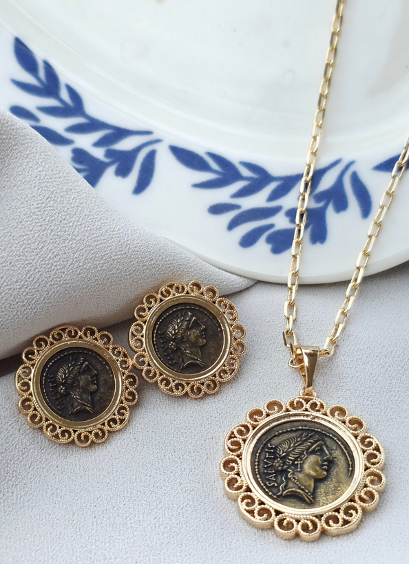این نیمست باشکوه، بازآفرینی مدرنی از جواهرات سلطنتی است. مدال گردنبند این مجموعه به صورت دو رو طراحی شده تا از هر دو سمت قابل استفاده باشد؛ یک سمت با نقش برجسته کلاسیک و سمت دیگر با ظاهری مشابه. قاب توری ظریف دور سکه و زنجیر دیپلمات ریزبافت، درخشش و جلوه این کار را دوچندان کرده است.