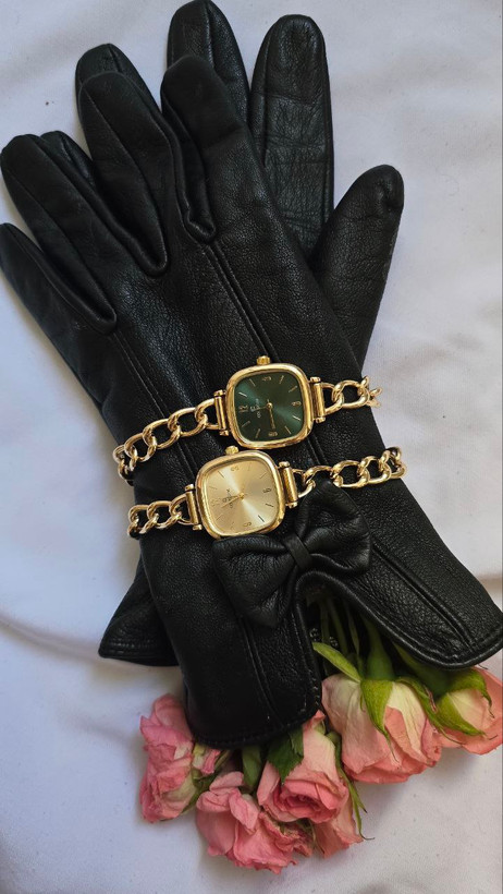 صفحهی مربعی سبز و گلد با جلوهای مخملی در کنار قاب و بند زنجیری طلایی، ترکیبی لوکس و خاص ایجاد کرده که بهراحتی با استایلهای رسمی و نیمهرسمی ست میشود.