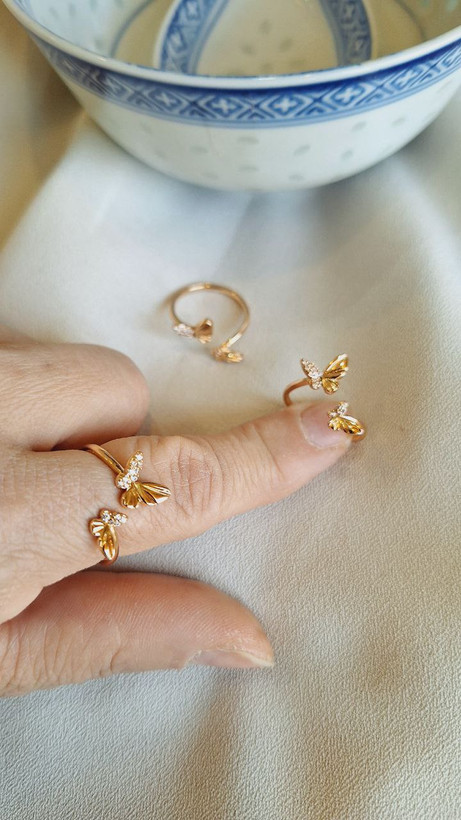 انگشتری خاص با طراحی دو پروانهی متقارن که هر کدام با نگینهای درخشان تزئین شدهاند. این طرح نمادی از لطافت و آزادیه و جلوهای دلنشین به دستان شما میبخشه. رنگ طلایی براقش، درخشش نگینها رو چند برابر کرده و این انگشتر رو به یکی از انتخابهای محبوب برای استایل روزمره و مهمونیها تبدیل کرده.