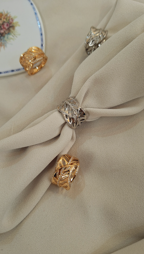 حلقه "Aurora" با طراحی برگهای ظریف و درخشش نگینهای ریز، انتخابی لوکس برای خانمهاییه که به ظرافت و خاص بودن اهمیت میدن. رنگ طلایی گرم و چشمنواز این مدل، جلوهای خاص به دستان شما میبخشه.